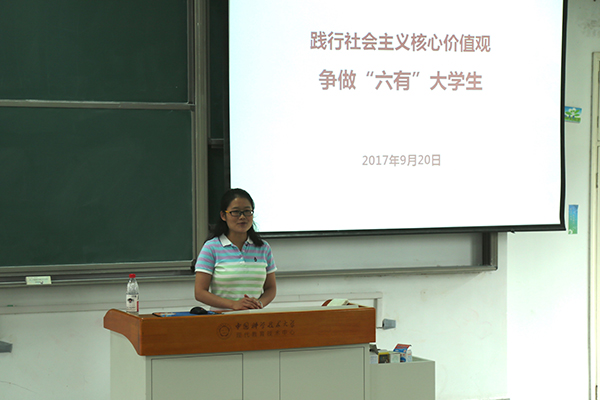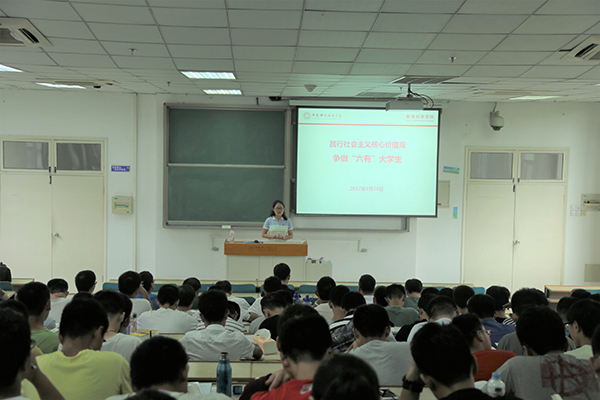 2017年9月20日下午4时在三教3C202教室,0029cc金沙贵宾会党委副书记杨晓果为2017级新生做了“践行社会主义核心价值观,争做“六有”大学生”的专题报告。2017级140多名本科新生参加了会议。