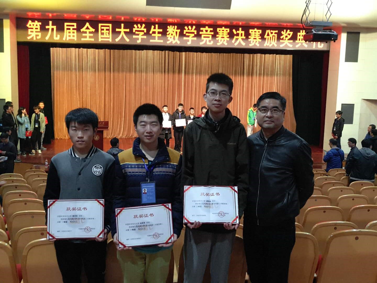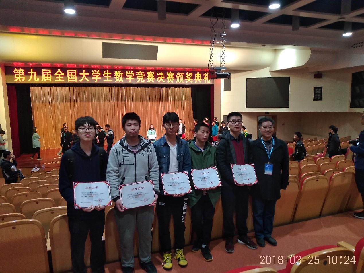 由中国数学会主办、西安交通大学承办的“第九届全国大学生数学竞赛”决赛,于2018年3月25日,在陕西省西安市圆满结束。经过激烈的角逐,我校参赛同学取得了优异的成绩,喜获数学专业决赛一等奖2名,二等奖3名;非数学专业决赛一等奖2名、二等奖1名。