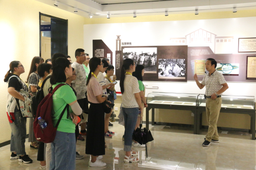 当日下午,与营员接待工作同时进行的,还有参观校园活动,伴着徐徐夏风与耀眼骄阳,两名志愿者邱安东、田玉峰带领着充满好奇的营员,参观了东区校园。一行人沿着老北门、樱花大道、天使路向着校史馆前进。汗水浸湿了每个人的营服,但大家的热情始终高涨,不禁为校园中浓浓的人文气息所感染。到了校史馆,营员们安静地倾听来自解说员声情并茂的讲解,了解了中国科大六十年来的奋斗与荣耀,也感受到了中国科大严谨治学、宁静致远的风貌。