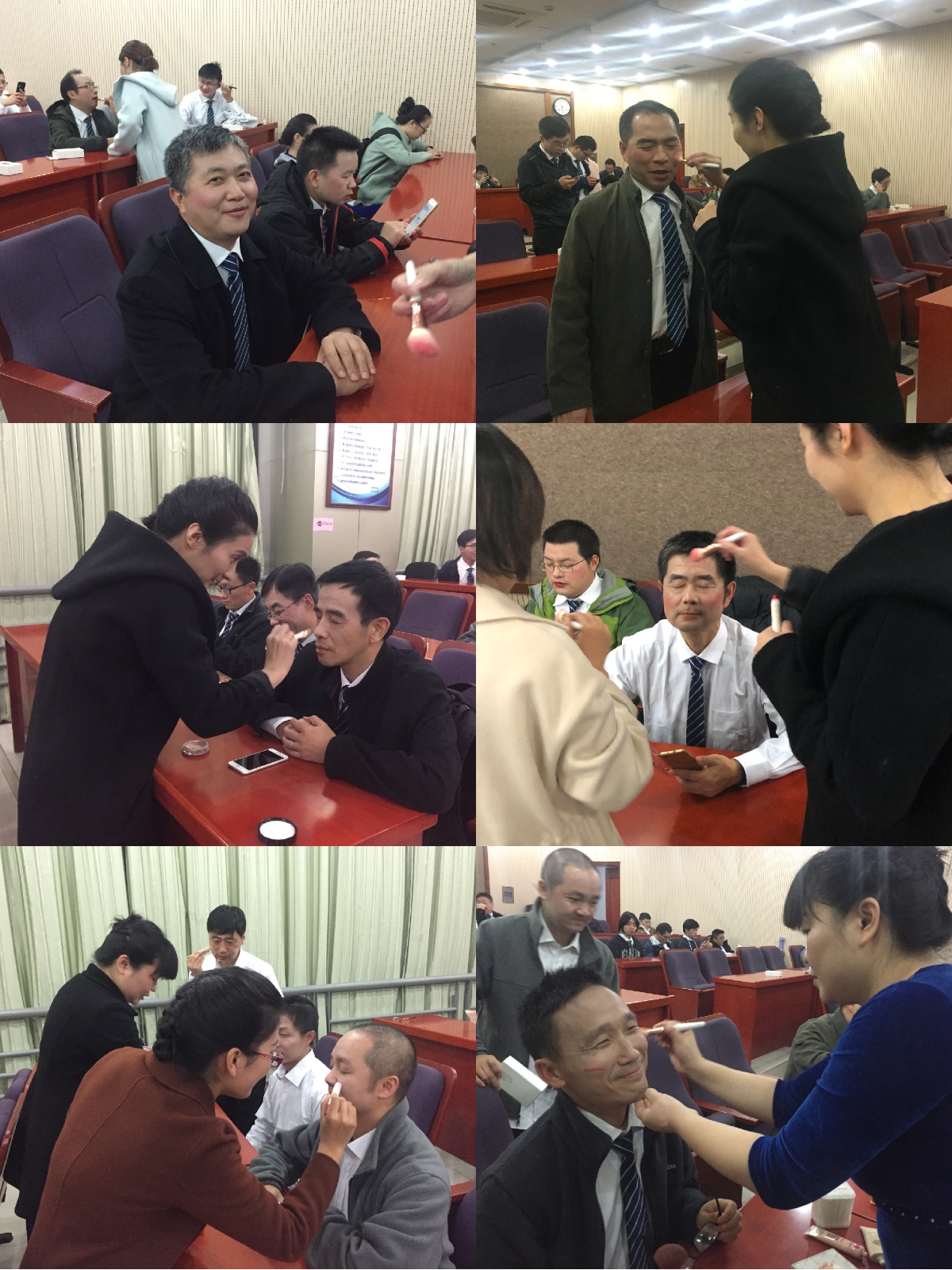 11月23日傍晚,各位老师下班后紧张地投入到展演前的化妆彩排工作。女老师们梳妆打扮后,积极主动地为男老师们化起妆。一开始,男老师们都显得较为腼腆,但是考虑舞台效果,大家都积极主动配合。现场不断传出阵阵笑声,老师们纷纷合影或自拍留念。每一位老师脸上都洋溢着灿烂的笑容,仿佛回到意气风发的年代,展现无尽的自信和从容。