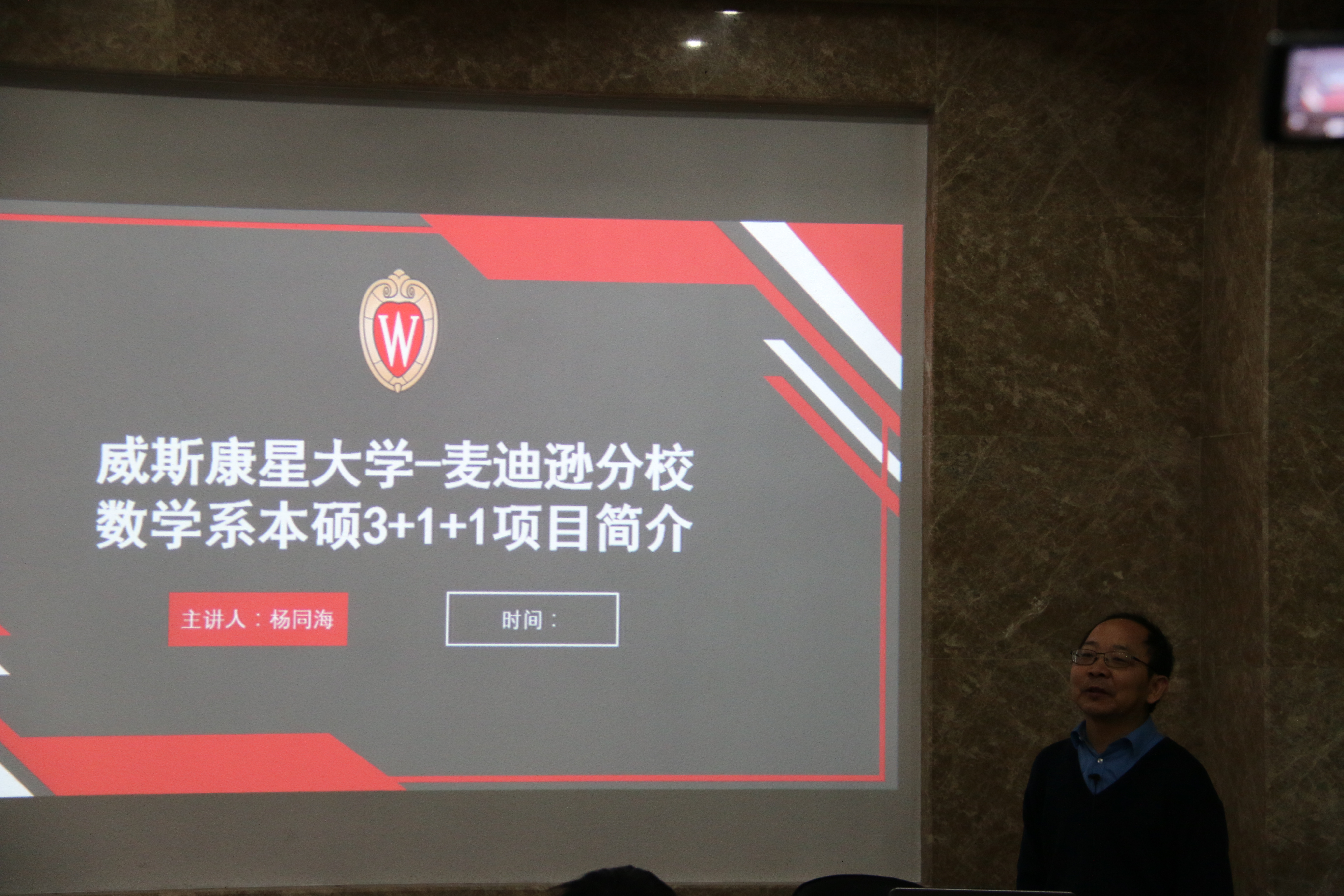 报告结束后,杨同海教授简要介绍了威斯康星大学麦迪逊分校数学系本硕3+1+1项目。威斯康星大学麦迪逊分校创建于1848年,是威斯康星大学系统的旗帜性学校,是美国大学协会(Association of American Universities)的创始会员之一,也是美国知名的十大联盟的创始成员之一,被誉为“公立常春藤”。威斯康星大学麦迪逊分校数学系本硕3+1+1项目旨在推动两校的学术交流与科研合作,共同培养具有国际化视野和创新精神的学生。参加该项目的本科生前三年在原高校进行修读,基本完成原高校课程指标(未修够学分可商议转换学分);第四年赴威斯康星大学麦迪逊分校接受美式教育,完成威斯康星大学学分要求,在一年的培养期结束后返回原校获得原高校学士学位;第五年赴威斯康星大学麦迪逊分校进一步修读硕士课程,完成学分要求后获得威斯康星大学麦迪逊分校硕士学位。