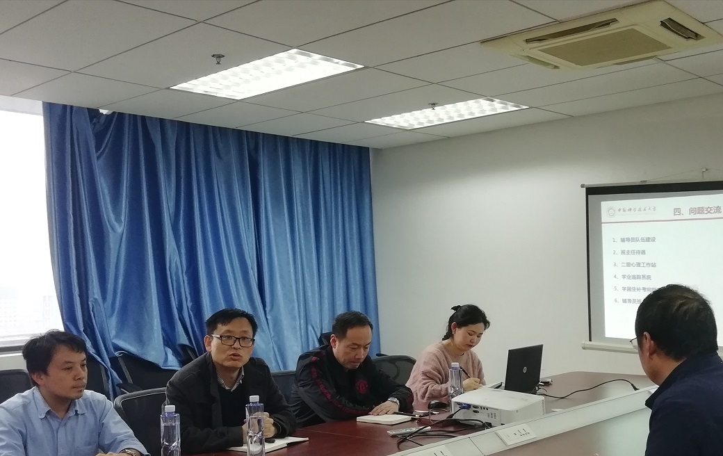 会上,邓建松首先对学工部(处)老师们的到来表示欢迎,他指出学生工作很重要,也很辛苦,班主任老师们以高度的责任心投入到工作中,不仅要关注学生的学业,更要关注学生的成长,注重沟通交流,注重维护学生的信心。李峰表示很高兴来到学院进行工作交流,学校的学工队伍建设是学生培养和学校发展的重要基础工作。校学工部(处)也一直想深入了解各院系学工队伍老师的困难和诉求,发现问题,分享经验,尽可能帮助学工队伍老师顺畅有效地完成学生培养工作。