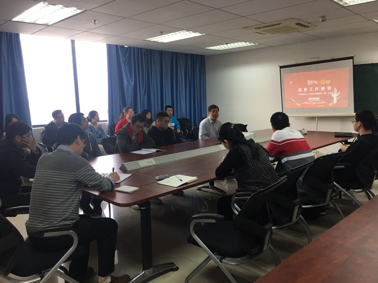 会上,邓建松首先对2019年《政府工作报告》进行了总体性解读。2019年是新中国成立70周年,是全面建成小康社会、实现第一个百年奋斗目标的关键之年。学习贯彻两会精神是高举中国特色社会主义旗帜,贯彻落实习近平新时代中国特色社会主义思想和十九大精神的重要举措,其中,尤其要高度重视对2019年《政府工作报告》的理解和把握。邓建松从2018年主要成就、2019年目标、2019年重点工作三个方面的关键数据进行了解读。与会人员围绕政府工作报告谈了个人学习体会。