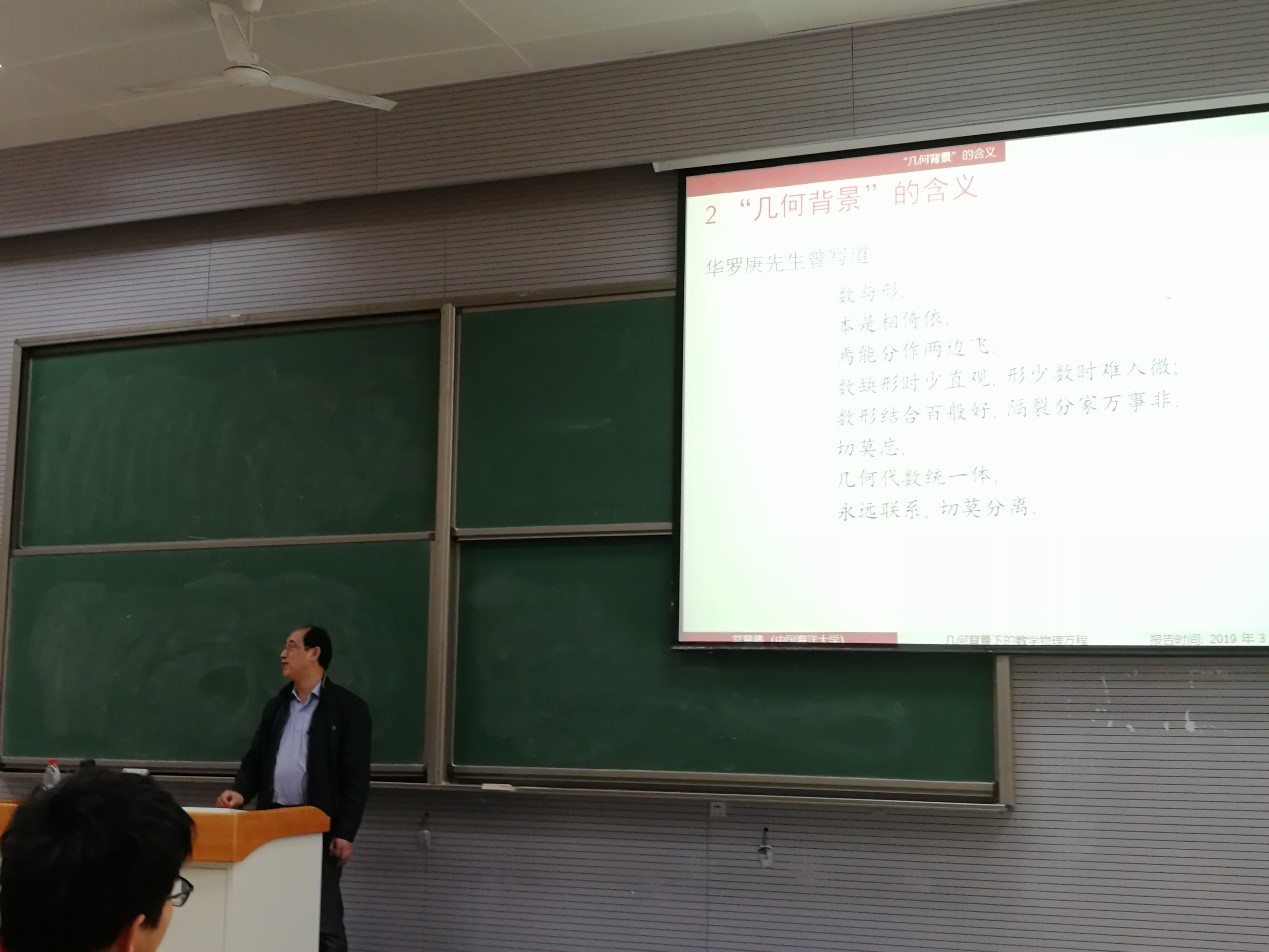 常老师从求解数理方程的两个最基本方法,即分离变量法和积分变换法谈起,提出如何在几何背景下统一地理解这些方法及其背后的理论基础。报告中引用我校数学系首任系主任华罗庚教授、清华大学萧树铁,以及刚刚逝世的国际数学大师阿蒂亚有关数与形,以及几何背景的理解,强调对数理方程理论和方法作适当的几何化,引入函数空间以及函数空间上的距离、�积等概念,选择合适的坐标系即基函数,可以将函数空间中的任意函数都表示成坐标的形式,当函数空间具有可数基时,任意函数的坐标展开就是一个无穷级数形式,比如,对有限区间上的平方可积函数空间,三角函数系就是一组基函数,相应的坐标展开就是傅里叶级数展开;而当函数空间具有类似于实数集的不可数基时,任意函数的坐标展开就是一个含参数积分形式,比如,对无穷区间上的绝对可积和平方可积函数空间,含有单参数的三角函数系就是一组基函数,相应的坐标展开就是傅里叶积分形式,最终引出傅里叶变换的定义及其应用。类比于空间解析几何,选定了坐标系之后,空间的几何问题就转化为相应坐标的代数问题,选定合适的坐标系之后,函数空间上的偏微分方程问题,就转化为相应坐标的常微分方程问题。
