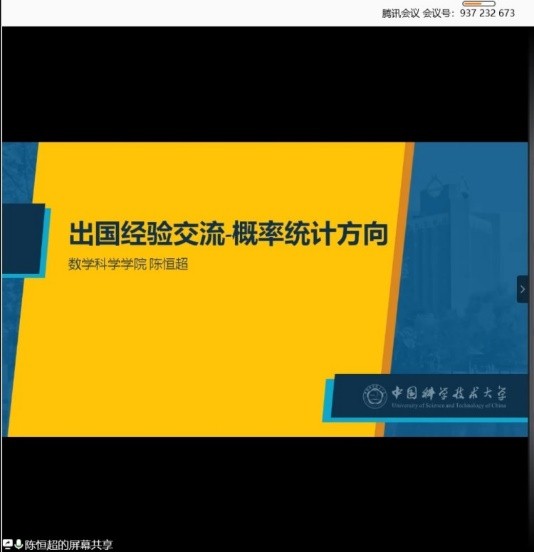 第二场是基础数学的吴天学长(科大保研)关于的成功保研经验的分享。学长先回答了一些同学比较关心的问题,然后从何谓保研出发,比较了其他单位的保研与科大数院保研的不同点,同时贴心地提出保研相关的注意事项,给大家提供了许多贴心的小建议。最后学长客观地提出保研、出国无高下之分,祝愿同学们可以选到自己心仪的学校。