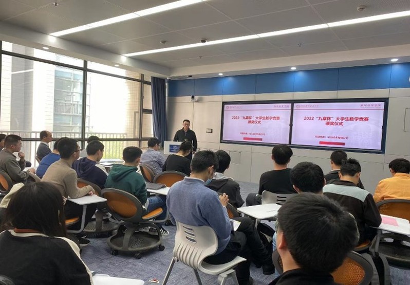 院党委书记、执行院长黄文向竞赛教练的辛苦付出和华为技术有限公司的大力支持表示感谢,向获奖的同学表示祝贺,并指出“九章杯”数学竞赛围绕党建中心工作,以学生培养为抓手,通过竞赛的形式,选拔出更多优秀的学生参加全国性比赛,同时对参赛同学提出期望与要求。华为上海研究所副所长、高校系统部部长左峻疆(9810届校友)发表了视频讲话,充分肯定了“九章杯”数学竞赛的重要意义,并简要介绍了华为公司在数学领域与大学合作的一些思考,表示五月份将在“九章杯”内部开启包括建模、信息论在内的应用数学的新赛道,希望同学们持续关注和积极参与。支部书记盛茂最后总结了本届“九章杯”的经验和不足,介绍了2022年“丘成桐大学生数学竞赛”最新情况,阐明了以基础数学支部党建活动推动“九章杯”数学竞赛的重要意义,并表示将继续扩大竞赛在学生中的影响力,为我校数学学科建设贡献力量。