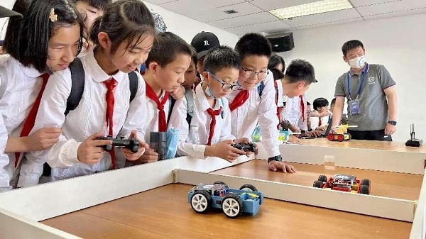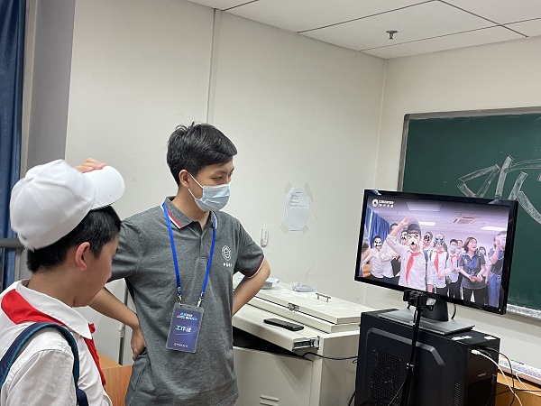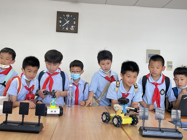 另一个项目是智能机甲战队演示。该项目展示了自主研发的3D打印竞技类机器人。体验者可以操作机器人进行现场互动竞技,完成打靶竞技任务。志愿者为参观的学生讲解机器人制作的原理和过程,鼓励中小学生从零开始设计创造机器人。