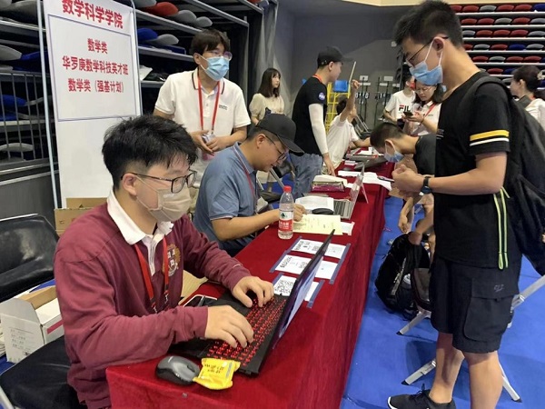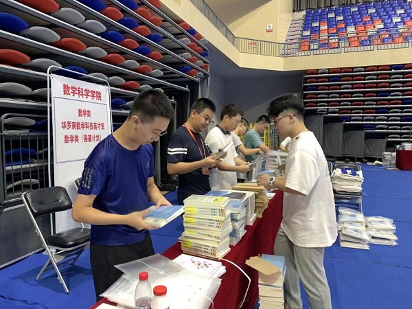 8月18日,即报到的前一天,数院学生会的志愿者们、学工老师和班助在中区体育馆为新生的报到做着准备。