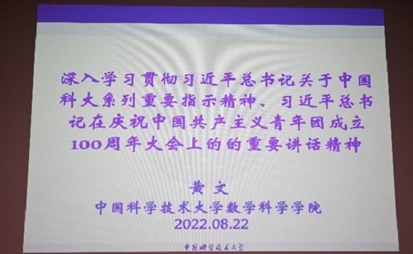 黄文老师带领新生深入学习习近平总书记关于中国科大系列重要指示精神,以及习近平总书记在庆祝中国共产主义青年团成立100周年大会上的重要讲话精神。同时,黄文老师也给大家介绍了0029cc金沙贵宾会的相关情况、科大人的初心和使命、“两弹一星”精神和老一辈科学家精神等。“今天你们以科大为荣,明天科大以你们为荣”是黄文老师对新生美好的祝福。