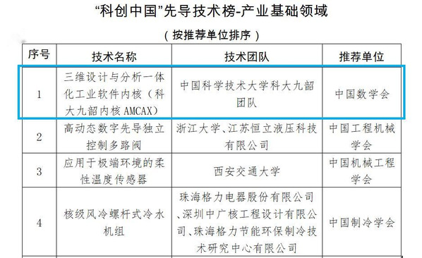 近日,2022年“科创中国”系列榜单遴选结果公示,安徽应用数学中心继入选首批“科创中国”工业软件创新基地(产学研协作类)之后,中心科大九韶团队携自主研发的三维设计与分析一体化工业软件内核(九韶内核AMCAX) ,在激烈遴选角逐中脱颖而出,荣列“科创中国”先导技术榜-产业基础领域榜单(共25项),也是安徽省唯一一家入选该专项的团队。